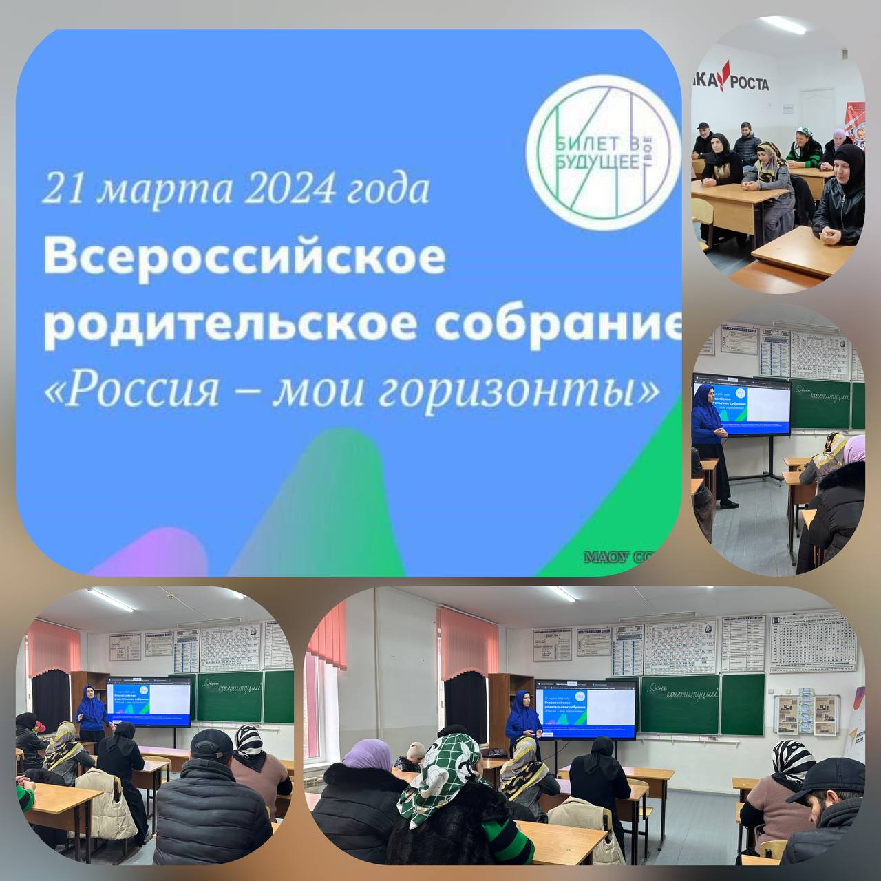 21.03.202421 марта 2024 г. Классный руководитель 8 “a" класса Хадиева З.А. провела Всероссийское родительское собрание "Россия-мои горизонты" Собрание прошло в рамках модели профориентации, которая внедрена с 1 сентября 2023 г в образовательных организациях России, реализующих образовательные программы основного общего и среднего общего образования