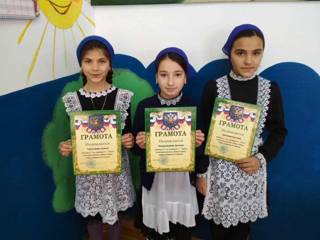 17 января 2018 г. в школе зам. директора по ВР Кадисов А. В. организовал конкурс рисунка «Зима в горах» среди учащихся младших классов. Дети приняли активное участие в конкурсе и хороших рисунков было немало. К удивлению жюри, самыми творческими учащимися оказались девочки из 4 «А» класса, которые заняли все призовые места, кл. руководитель Меджидова З. А.