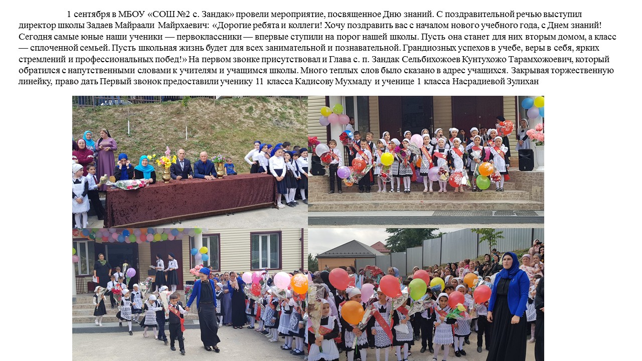 01.09.20181 сентября в МБОУ «СОШ №2 с. Зандак» провели мероприятие, посвященное Дню знаний. С поздравительной речью выступил директор школы Задаев Майраали Майрхаевич: «Дорогие ребята и коллеги! Хочу поздравить вас с началом нового учебного года, с Днем знаний! Сегодня самые юные наши ученики — первоклассники — впервые ступили на порог нашей школы. Пусть она станет для них вторым домом, а класс — сплоченной семьей. Пусть школьная жизнь будет для всех занимательной и познавательной. Грандиозных успехов в учебе, веры в себя, ярких стремлений и профессиональных побед!» На первом звонке присутствовал и Глава с. п. Зандак Сельбихожоев Кунтухожо Тарамхожоевич, который обратился с напутственными словами к учителям и учащимся школы. Много теплых слов было сказано в адрес учащихся. Закрывая торжественную линейку, право дать Первый звонок предоставили ученику 11 класса Кадисову Мухмаду и ученице 1 класса Насрадиевой Зулихан