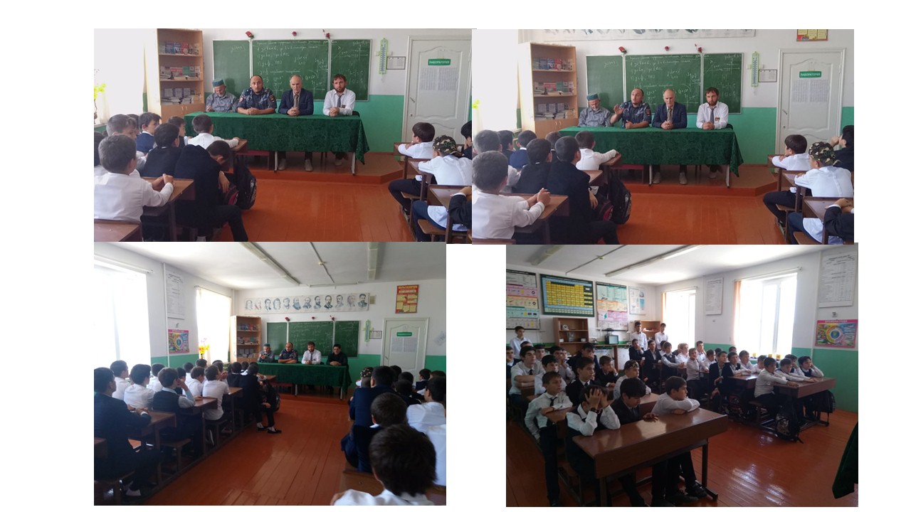 06.09.2018В СОШ№2 с. Зандак 06.09.2018г. в рамках по реализацию протокольного поручения Главы Чеченской республики Р.А. Кадырова от 17.09.2014г. Номер 01-83, проведено мероприятие по профилактике экстремизма и терроризма с учащимися 5-х и 10-11-х классов (мальчики), всего 29 человек.