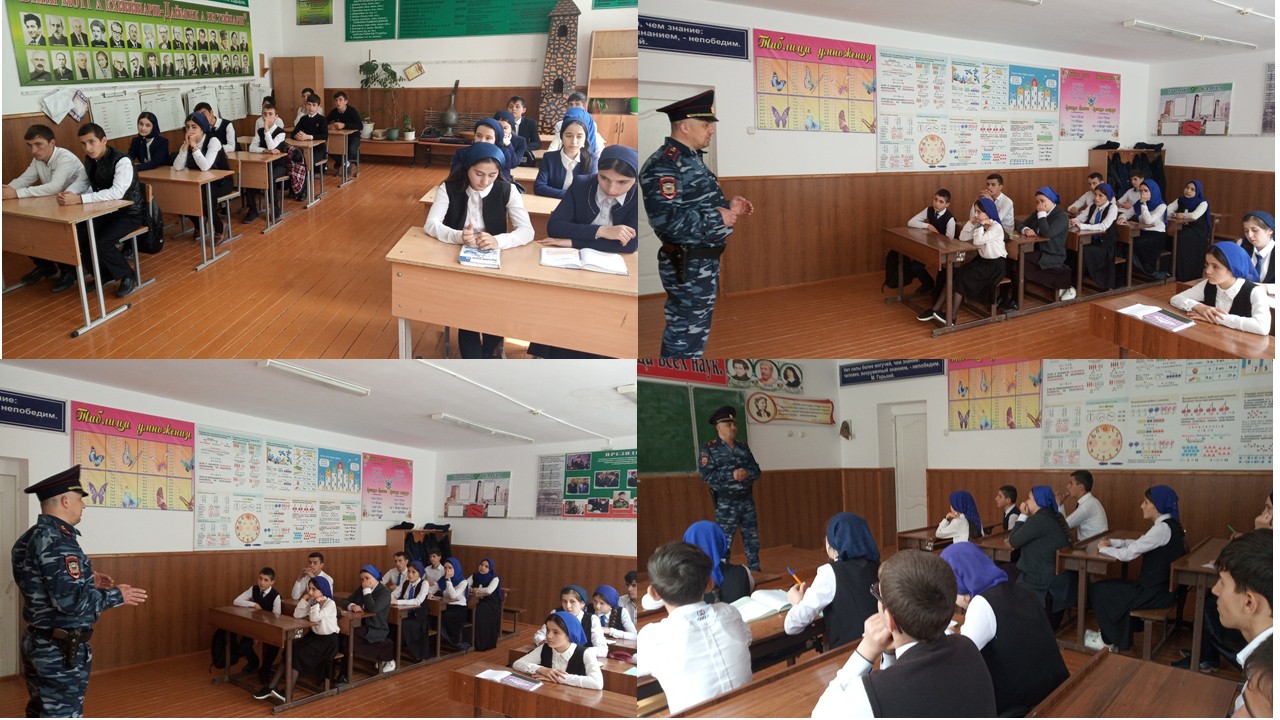 14 мая, с целью профилактики преступности в молодежной среде, а также других правонарушений и преступлений, совершаемых несовершеннолетними, в школе была организована встреча учащихся с инспектором ПДН ОМВД Росссии по Ножай-Юртовскому району ЧР майором полиции Хасимхановым М. Л. Встреча с подростками в школе и проведение плановых профилактических бесед является неотъемлемой частью совместной работы инспектора по делам несовершеннолетних и социального педагога школы.